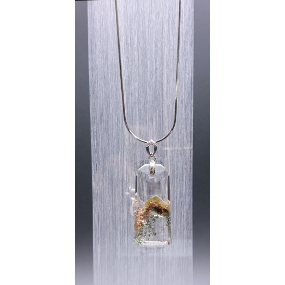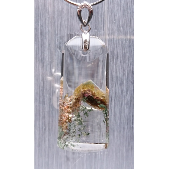 幽靈水晶,又稱異像水晶。異象水晶是指在水晶的生長過程中,包含了不同顏色的火山泥等礦物質,在通透的白水晶里,浮現如雲霧、水草、漩渦甚至金字塔等天然異象,內包物顏色為綠色的則稱為綠幽靈水晶,同樣道理,因火山泥灰顏色的改變,也會形成紅幽靈、白幽靈、紫幽靈、灰幽靈水晶等。