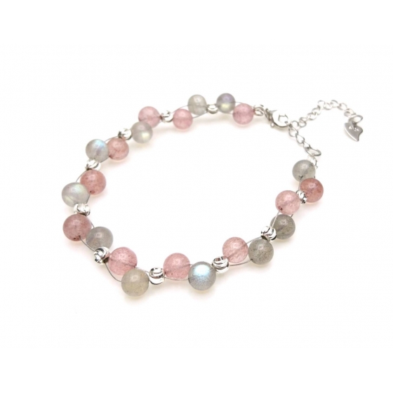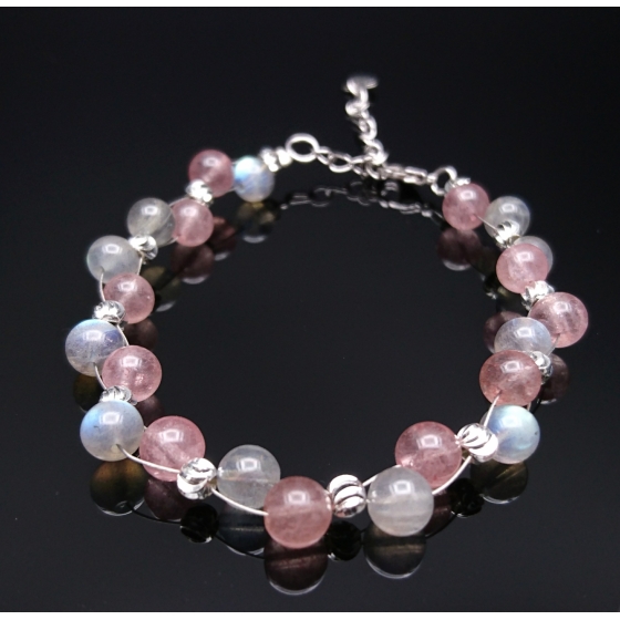 草莓晶、灰月光石6mm珠,925銀南瓜珠。
